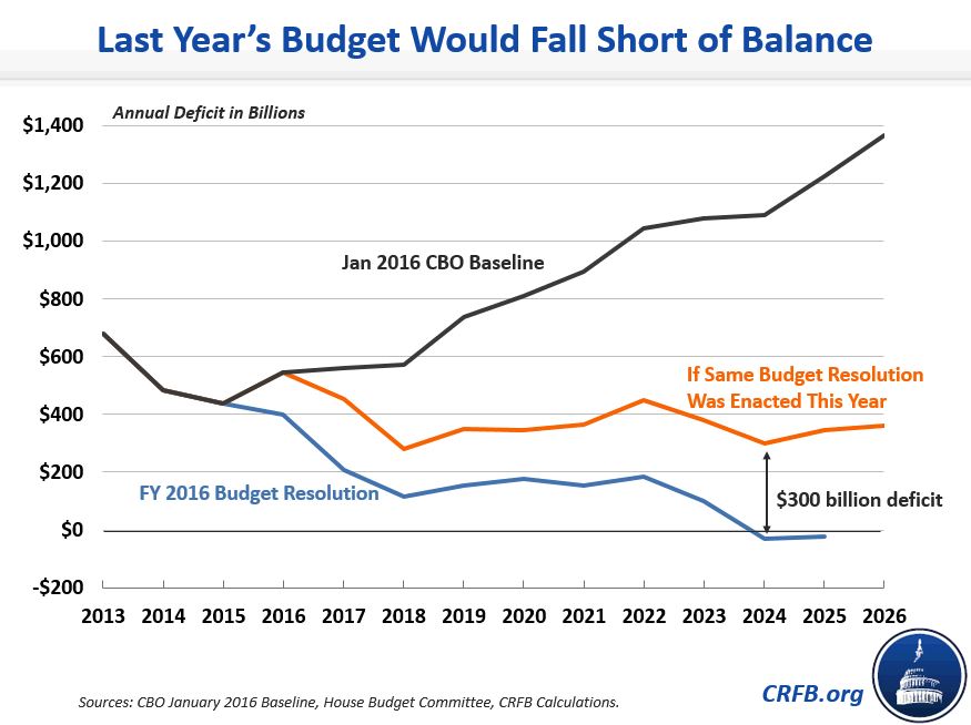 * The path of non-interest deficit reduction assumed is a linear increase of the FY 2016 congressional budget resolution's savings with implementation starting in 2017. The deficit reduction is run through an interest model that calculates total deficit reduction. Due to timing shifts and our assumed path, the budget would balance in FY 2024 as well.
