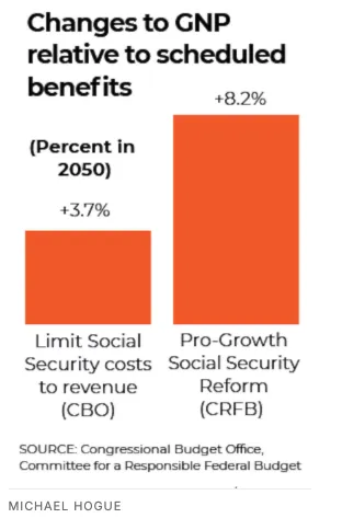 A balanced Social Security program would also make us all collectively richer. According to estimates from the Congressional Budget Office, limiting Social Security’s costs to its revenue would increase per-person incomes by nearly 4% by 2050. If achieved using a pro-growth reform package like one my organization proposed in 2019, per-person incomes could rise by more than 8%.