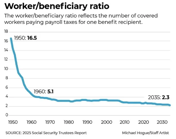 Social Security’s problems come down to hard math. Due to demographic changes like longer life expectancy and declining fertility rates, the ratio of workers paying taxes to current beneficiaries has dropped significantly, from 16-to-1 decades ago to under 3-to-1 today. The system must be updated, not because people didn’t “earn” their checks, but because the numbers don’t add up.