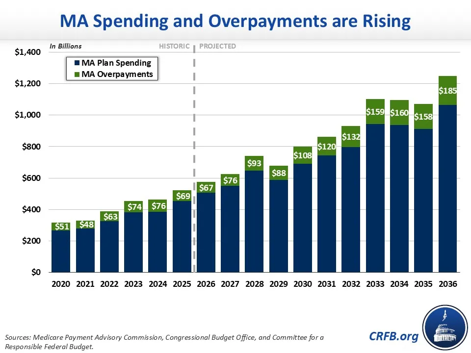 MA is a privately managed alternative to traditional Medicare. Although these plans have the potential to be more cost-effective than traditional Medicare, they end up costing the federal government far more – mainly because they take advantage of risk adjustments in their capitated payments, including by “upcoding” enrollees to make them appear sicker than they truly are. In total, the Medicare Payment Advisory Commission (MedPAC) estimates MA plans will be overpaid by about 14%, or $76 billion, in 2026.