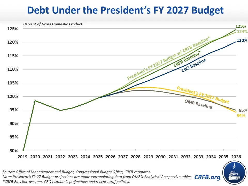 - Compared against a baseline assuming CBO’s growth projections, the removal of tariff revenue ruled illegal by the Supreme Court, and the Administration’s recent tariff policies, we estimate debt held by the public would rise to 124% of GDP by FY 2036 under the President’s budget versus 125% under our baseline.