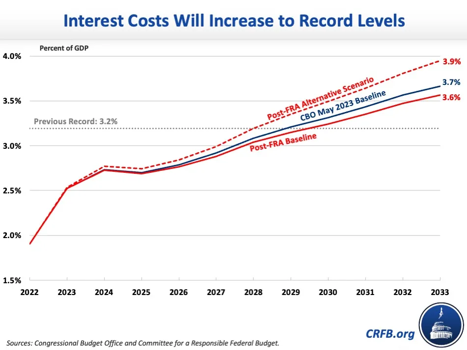 Under our post-FRA Alternative Scenario, interest costs would grow from $665 billion in FY 2023 to $1.6 trillion in 2033. As a share of GDP, interest would grow to a record 3.9 percent of GDP by 2033.