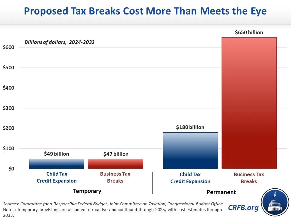 According to Laura Weiss of CQ (paywall), the package in question would include roughly $49 billion from expanding the CTC and $47 billion of business tax breaks. Based on discussions with Hill staff, our understanding is that the $49 billion expansion would include three tax years (retroactive from 2023 to 2025) while the business tax extenders would include retroactivity and go through 2025 as well.