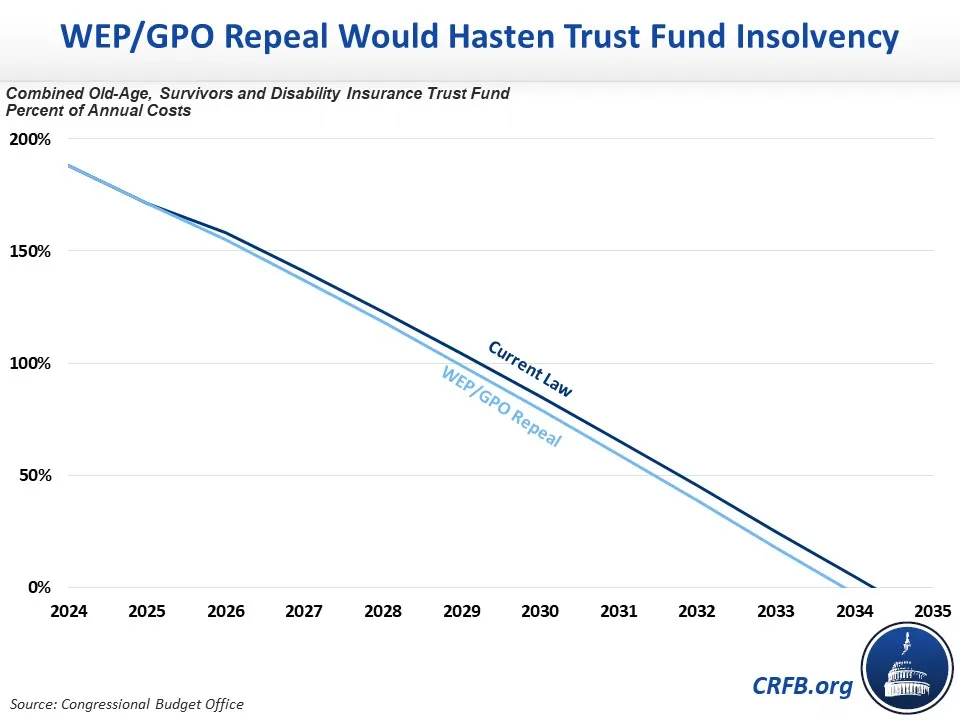 While the WEP/GPO provisions are poorly designed, they serve a real purpose, and there has long been bipartisan interest in reforming them so as not to unduly punish retirees with their blunt mechanism. However, simply repealing them – as this bill would do – without replacing the savings would increase deficits by $196 billion while advancing the theoretically-combined trust fund insolvency by six months.