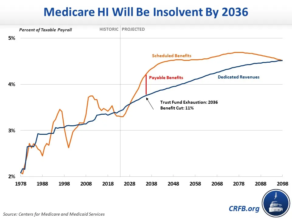 The Medicare Trustees estimate that the Medicare HI trust fund will exhaust its reserves by 2036, when today's 53-year-olds are eligible for the program and today's youngest beneficiaries turn 77. Upon insolvency, HI spending will be cut by 11 percent, and that cut will continue to grow to 13 percent by 2048. This cut is likely to lead to lead to disruptions in the health services and access to care.
