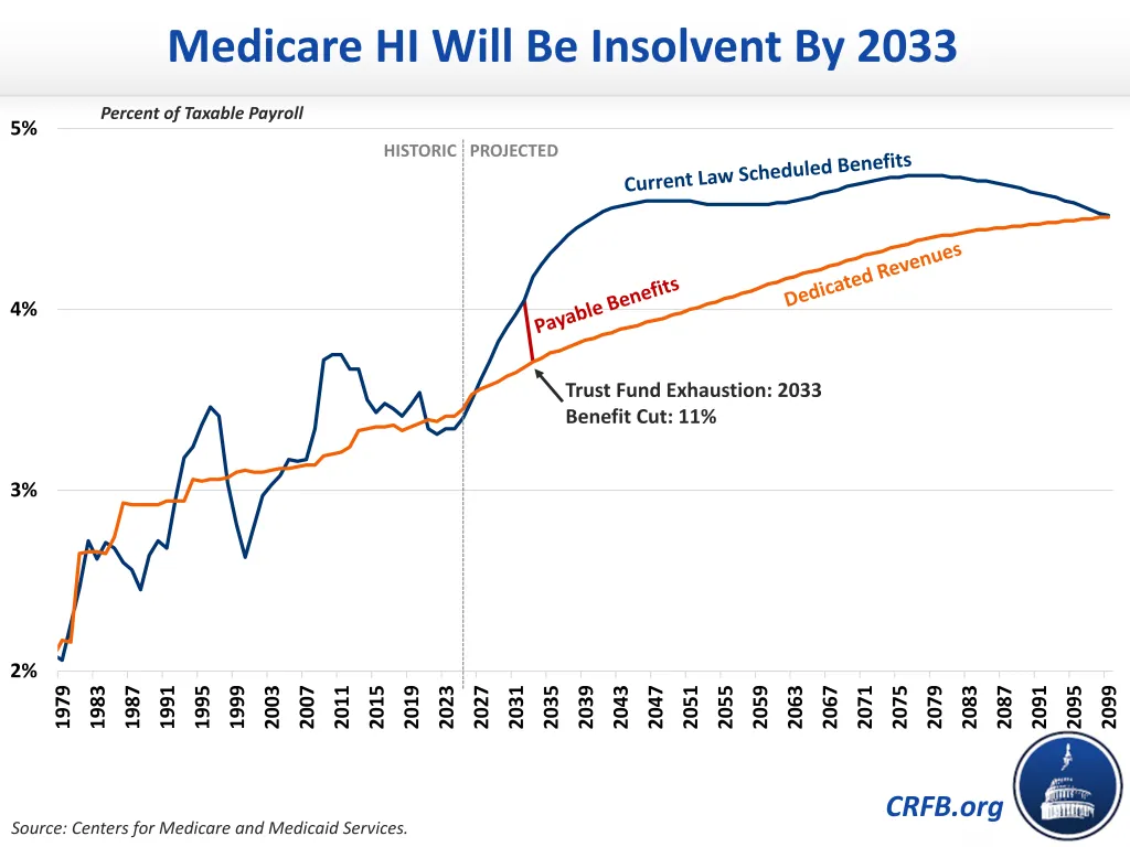 - Medicare’s Hospital Insurance (HI) trust fund will deplete its reserves by 2033.