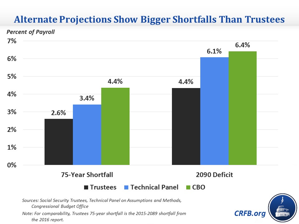 The Trustees' intermediate scenario shows the combined Social Security trust funds being exhausted in 2034, a 2.6 percent* of payroll 75-year shortfall, and a 2090 deficit of 4.35 percent. The Technical Panel last year estimated worse numbers: a 3.42 percent of payroll shortfall, a 6.08 percent deficit in 2090, and a trust fund exhaustion date one year earlier at 2033. CBO's numbers were worse than that: a 75-year shortfall of 4.37 percent of payroll, a 2090 deficit of about 6.4 percent, and an insolvency date of 2029 – five years earlier than the Trustees.