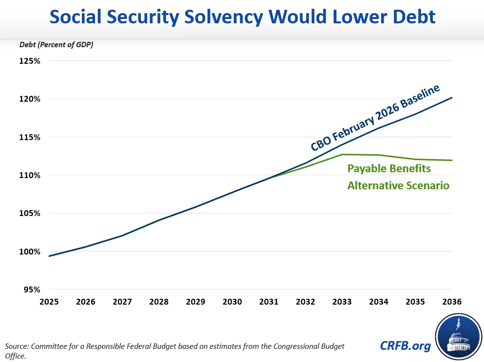 Under CBO’s baseline, which is required by law to assume that Social Security will continue to pay scheduled benefits after its trust funds become insolvent, the national debt is projected to rise from a near-record 100% of Gross Domestic Product (GDP) today to 120% of GDP by FY 2036, and annual deficits will grow to 6.7% of GDP.