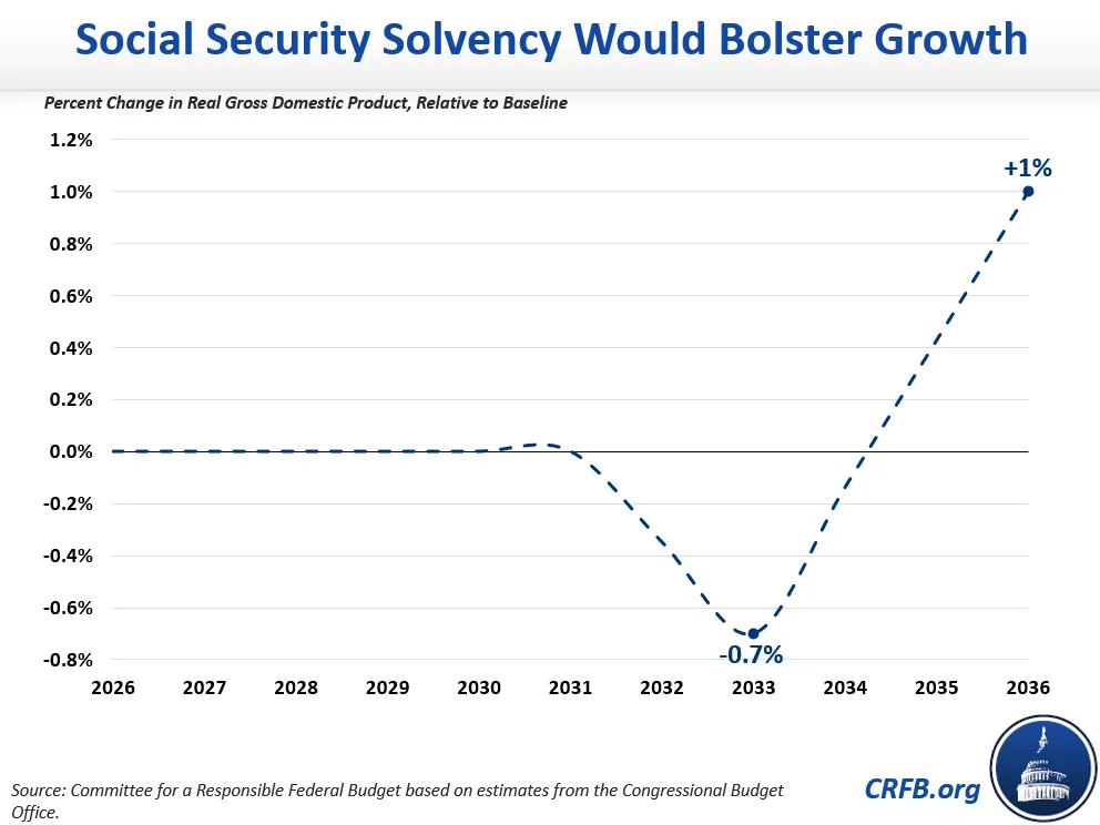 As CBO’s analysis underscores, policymakers should begin the urgent work of shoring up Social Security’s finances and restoring long-term solvency to the program. Even blunt and abrupt changes to bring Social Security into balance would meaningfully improve the budget and economy over time. A thoughtful solvency package could go a long way toward boosting incomes and fixing the debt.