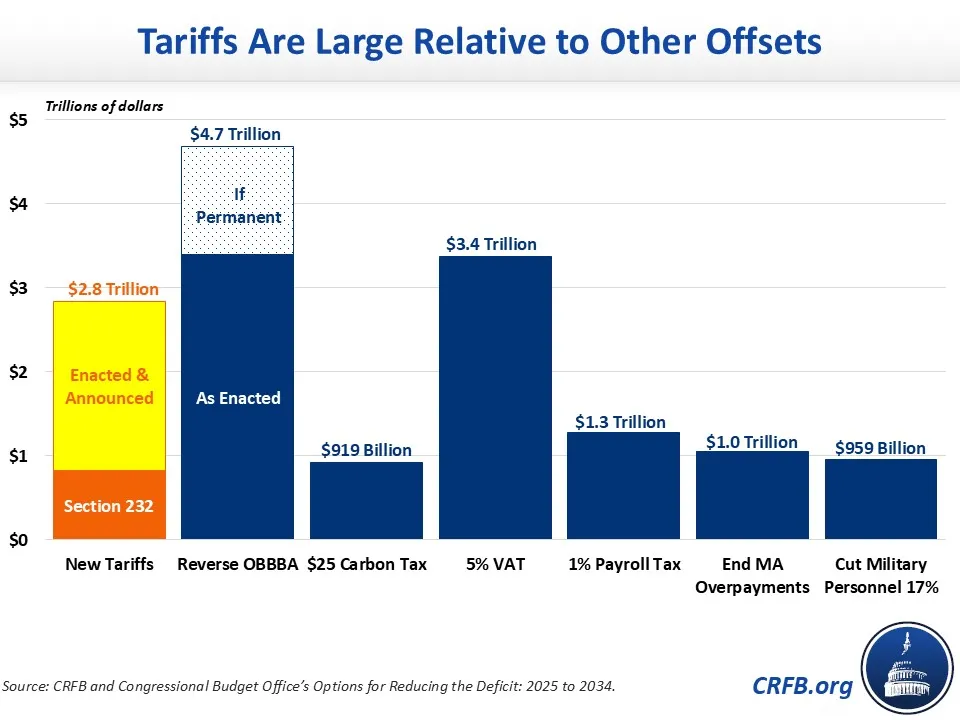 To put the tariffs in context, they are larger than what would be collected from a new 1 percent payroll tax, a $25 carbon tax, an elimination of Medicare Advantage overpayments, or a 17 percent reduction in military personnel. They are somewhat smaller than what would be collected from a 5 percent broad Value-Added Tax (VAT) or reversing the One Big Beautiful Bill Act (OBBBA), and they are about 60 percent the size of a permanent version of OBBBA.