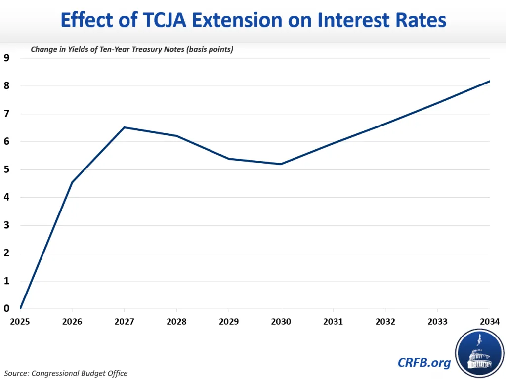At the same time, CBO finds the “crowd out effect” of the increased borrowing under a non-offset TCJA extension would meaningfully boost interest rates over time. Specifically, CBO projects interest rates on ten-year treasuries would be 0.05 percentage points higher by FY 2030, 0.08 percent higher by 2034, and growing at a rate of roughly 0.008 percent per year.