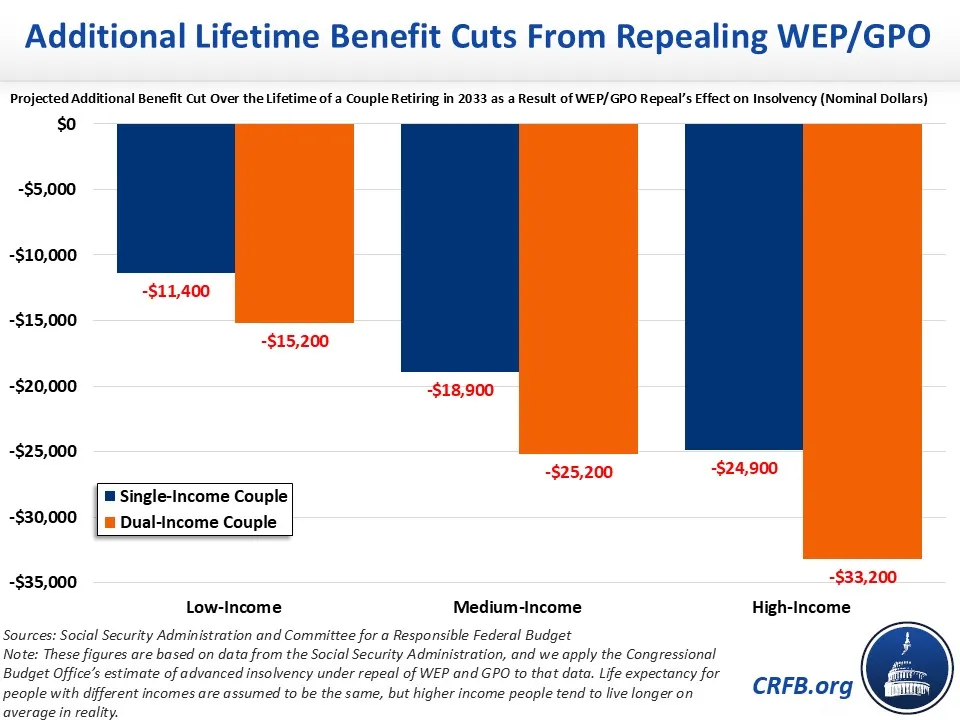 Lawmakers are considering the repeal of Social Security’s Windfall Elimination Provision (WEP) and Government Pension Offset (GPO). Not only would this repeal unfairly expand windfall benefits by allowing some beneficiaries to effectively double-dip from Social Security and their state or local alternative, but it would also advance Social Security insolvency by roughly half a year and increase the legally required across-the-board cut by about 5 percent. As a result, we estimate WEP/GPO repeal would lead to an additional $25,000 of lifetime benefit cuts for a typical couple retiring in 2033.