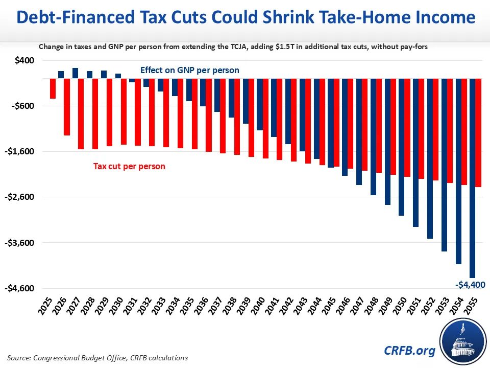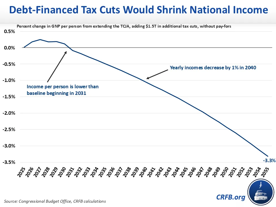 The Congressional Budget Office (CBO) recently found that extending the 2017 Tax Cuts and Jobs Act (TCJA) and adding $1.5 trillion in additional tax cuts, as the Fiscal Year (FY) 2025 Senate reconciliation instructions propose to do, would significantly reduce per-person income – ultimately by more than the size of the tax cut.