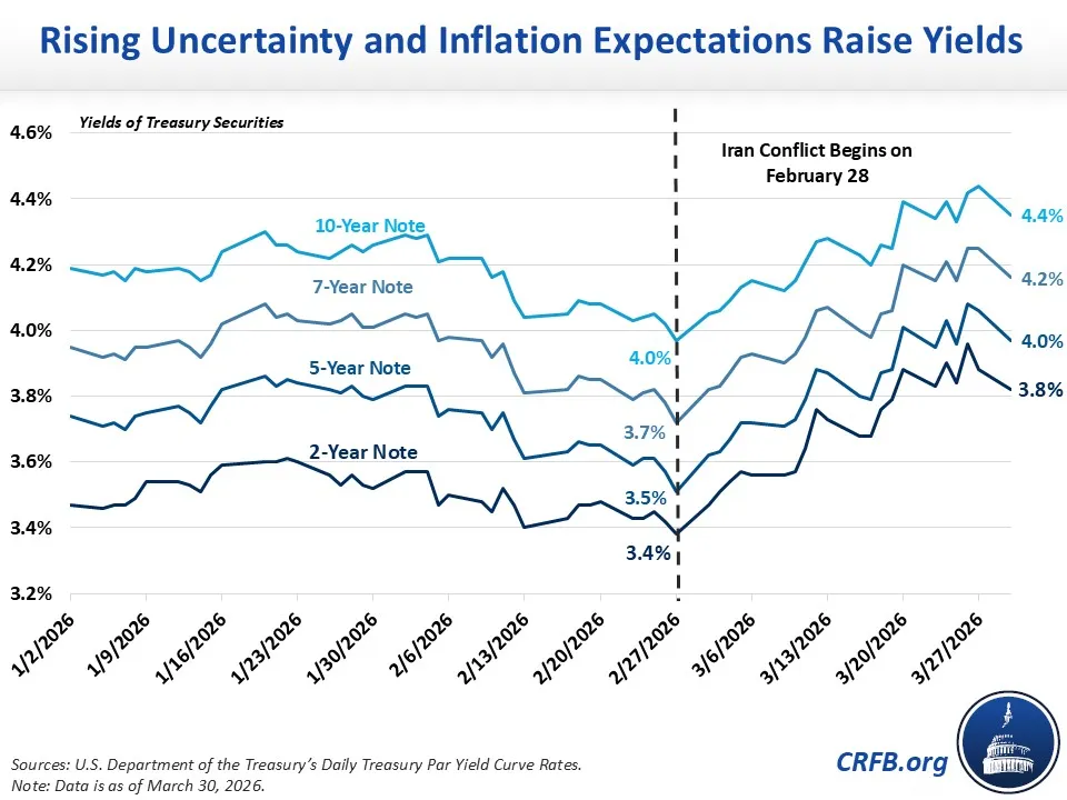 Indeed, yields on Treasury securities have been rising since the beginning of the recent conflict in Iran with the 2-year, 5-year, and 7-year Treasury notes all increasing by over 40 basis points since February 27. As of March 30, yields for the 2-year, 5-year, and 7-year notes stood respectively at 3.8%, 4.0%, and 4.2% – higher than their yields at the end of February of 3.4%, 3.5%, and 3.7%. Yields on the 10-year note and 30-year bond have also increased significantly, with the 10-year rising from 4.0% to 4.4% and the 30-year rising from 4.6% to 4.9%.