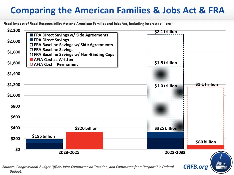 The American Families and Jobs Act (AFJA) that recently passed the House Ways and Means Committee would add $320 billion to the deficit over the next 28 months – wiping away the near-term savings from the Fiscal Responsibility Act (FRA) 1.7 to 2.6 times over. If made permanent, we estimate the AFJA would add over $1.1 trillion to the national debt over a decade, wiping out over three-quarters of the FRA's total deficit reduction as written, more than half of the FRA's savings if non-binding appropriations targets are met, and more than all of the FRA's savings after various "side deals" made outside the FRA are incorporated.