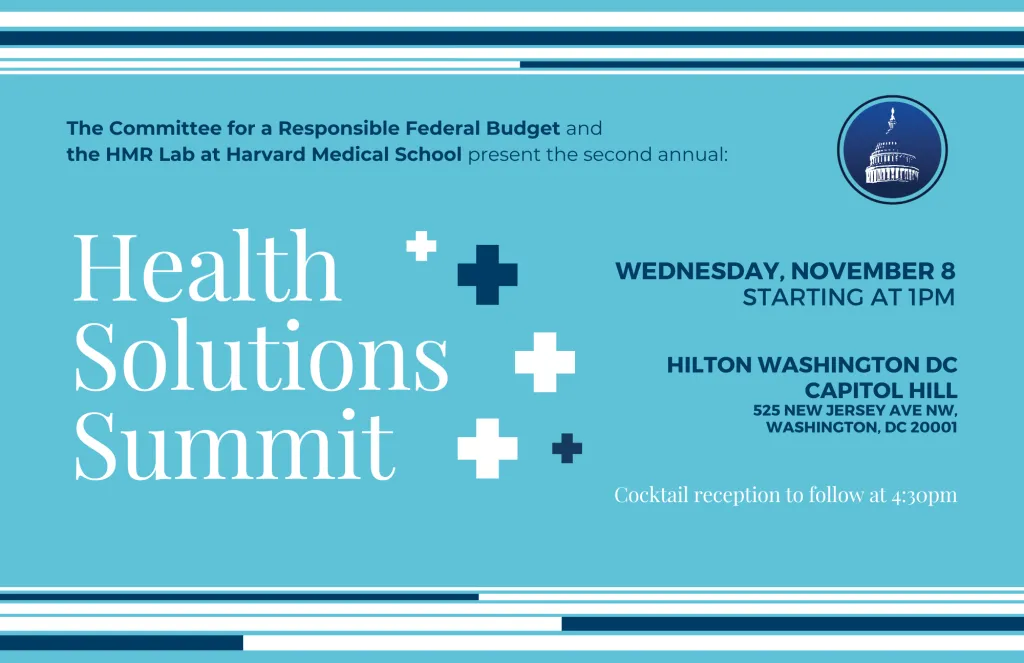 Rising health care costs play a large role in the nation’s long-term fiscal challenges and it will take substantial reforms to reverse course. The 2nd Annual Health Solutions Summit will examine options for policymakers in two key areas, while also reviewing the outlook for end-of-year legislation. Please join the Committee for a Responsible Federal Budget and the Health Care Markets and Regulation Lab at Harvard Medical School on Wednesday, November 8.