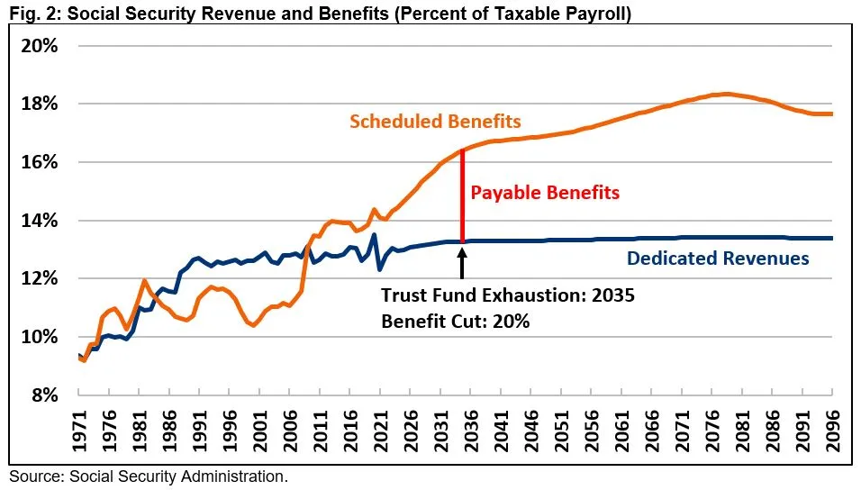 Over the long term, the Trustees project Social Security’s cash shortfall (assuming full benefits are paid) will grow to 2.8 percent of taxable payroll (1.0 percent of GDP) by 2032, to 3.5 percent of payroll (1.2 percent of GDP) by 2042, and to a high of 4.9 percent of payroll (1.7 percent of GDP) by 2079. Costs will then decline to 4.3 percent of payroll (1.4 percent of GDP) by 2096.