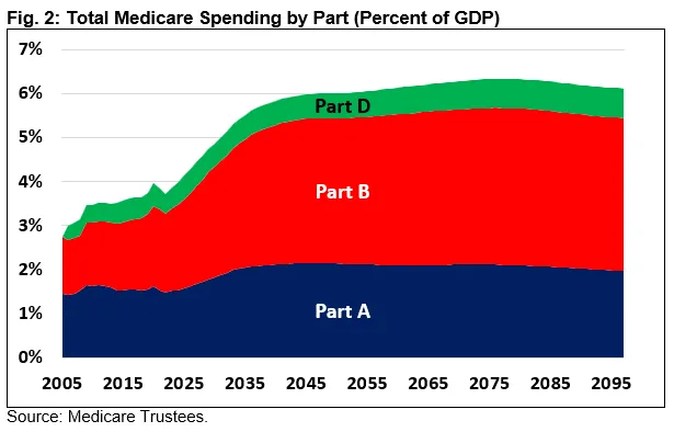 Medicare Part B spending would grow from 1.9 percent of GDP in 2023 to 3.6 percent in 2050 and to 4.6 percent in 2097 (compared to official projections of 3.3 percent and 3.5 percent, respectively).