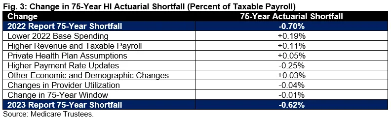 Offsetting much of this improvement, higher inflation and other factors led the Trustees to project increased provider payment updates (0.25 percent deterioration) and higher utilization of hospital care relative to post-acute care (0.04 percent net deterioration). The addition of 2097 into the projection window added a final 0.01 percent of payroll to the shortfall.