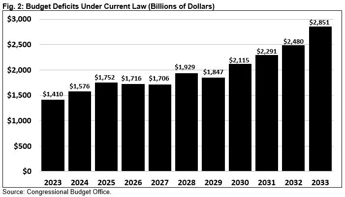 CBO projects debt will grow by $22 trillion over the next decade, nearly doubling from about $24 trillion at the end of FY 2022 to above $46 trillion by 2033.