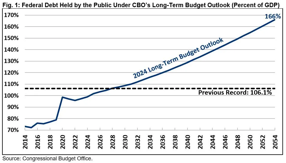 - Debt Will Surge Past Record Levels as a Share of the Economy, with federal debt held by the public rising from 97 percent of Gross Domestic Product (GDP) in Fiscal Year (FY) 2023 to a record 166 percent of GDP by 2054.