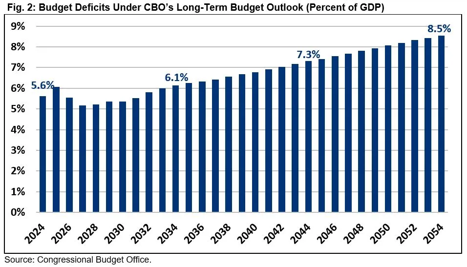 - Deficits Will Grow Rapidly, from an already-high 5.6 percent of GDP in FY 2024 to 8.5 percent of GDP by 2054. The 2054 deficit will be more than twice the 50-year historical average and higher than any time in modern history outside of World War II, the Great Recession, and the COVID-19 pandemic.