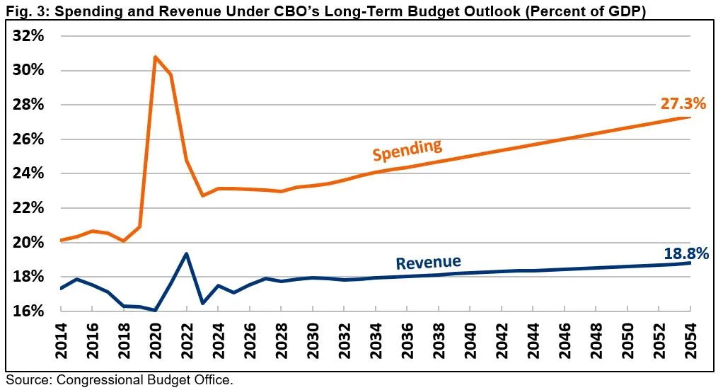 Rising deficits and debt are driven by rapid spending growth in combination with only modest revenue growth. Specifically, CBO projects spending will grow from 23.1 percent of GDP in FY 2024 to 24.1 percent of GDP by 2034, 25.7 percent of GDP by 2044, and 27.3 percent of GDP by 2054. Meanwhile, revenue will rise from 17.5 percent of GDP in FY 2024 to 17.9 percent of GDP by 2034, 18.4 percent of GDP by 2044, and 18.8 percent of GDP by 2054. For comparison, the 50-year historical average is 21.0 percent of GDP for spending and 17.3 percent of GDP for revenue.