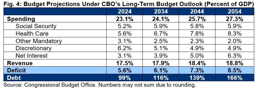 - Spending Will Grow Much Faster than Revenue, rising from 23.1 percent of GDP in FY 2024 to 24.1 percent by 2034 and to 27.3 percent by 2054. Interest costs will more than double from 3.1 percent of GDP in 2024 to 6.3 percent by 2054, while major health and retirement spending will grow from 10.7 percent of GDP to 14.1 percent. Revenue will also grow but much more modestly – from 17.5 percent of GDP in 2024 to 18.8 percent by 2054.