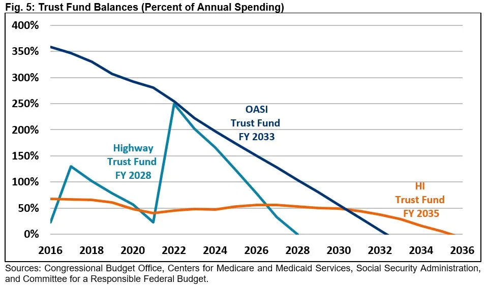 - Major Trust Funds Are Approaching Insolvency, with the Highway Trust Fund running out by FY 2028, the Social Security Old-Age and Survivors Insurance (OASI) trust fund exhausting its reserves by FY 2033, and the Medicare Hospital Insurance (HI) trust fund reaching insolvency by FY 2035. On a theoretically combined basis, the Social Security retirement and disability insurance trust funds will be insolvent by FY 2034.