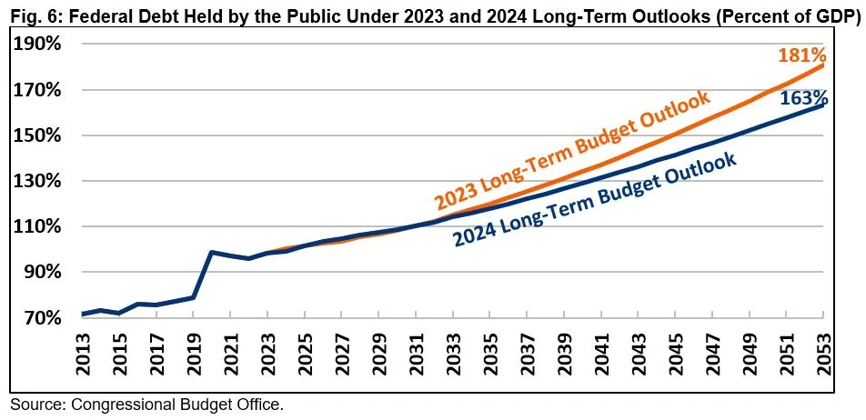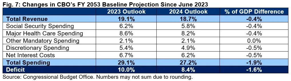 CBO now projects lower deficits and debt than in the June 2023 Long-Term Outlook. Specifically, CBO projects debt to total 163 percent of GDP in 2053, compared to 181 percent of GDP in its prior outlook; CBO projects deficits to total 8.4 percent of GDP, compared to 10.0 percent previously.