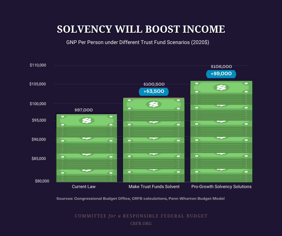 This suggests that trust fund solvency packages could boost annual per-person income by 3.5 to 9 percent after three decades, or $3,500 to $9,000 in today’s dollars.