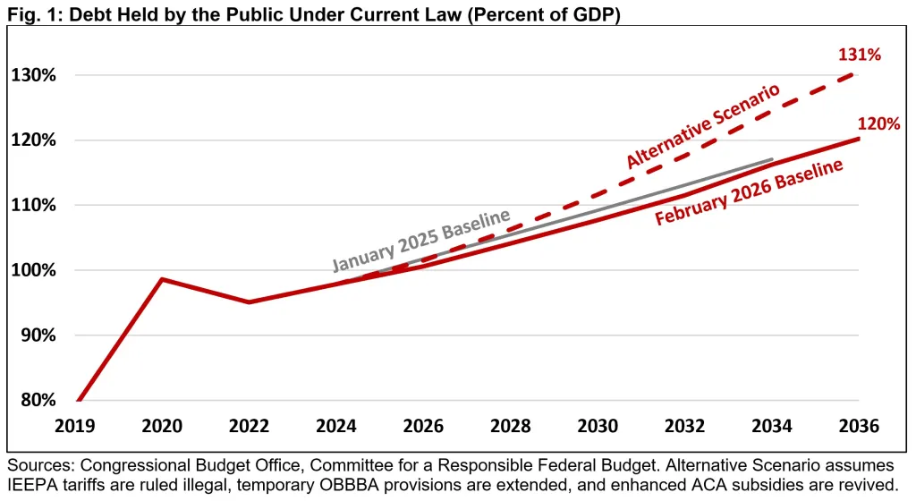 Actual debt could grow even faster than CBO’s baseline projections. For example, we estimate debt would rise to 131% of GDP by 2036, as opposed to 120%, if the Supreme Court rules that many of the recently-imposed tariffs are illegal, lawmakers make permanent the temporary provisions in OBBBA, and enhanced Affordable Care Act health insurance subsidies are revived on a permanent basis.