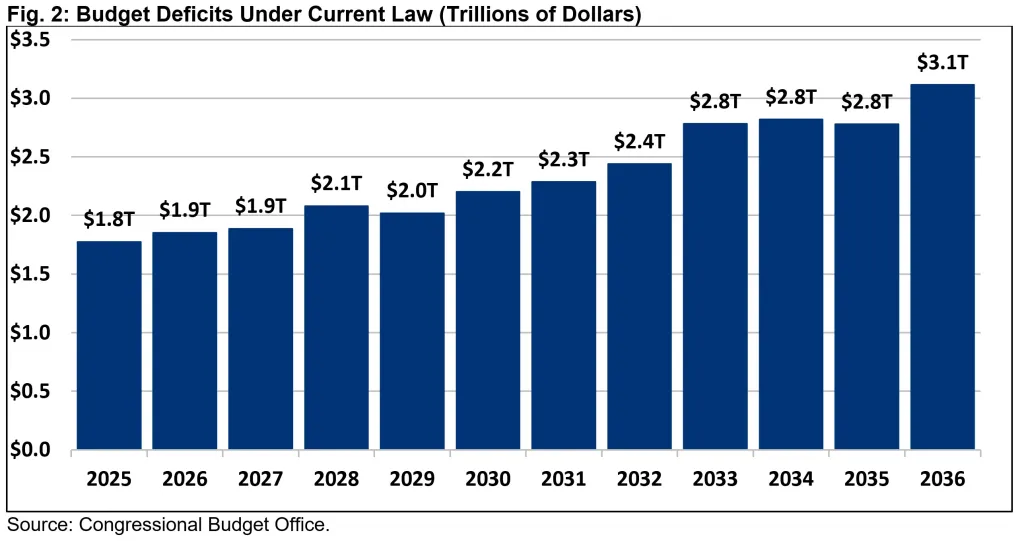 CBO projects annual budget deficits will grow from less than $2 trillion in 2025 to over $3 trillion by 2036, totaling $24.4 trillion over the next decade.