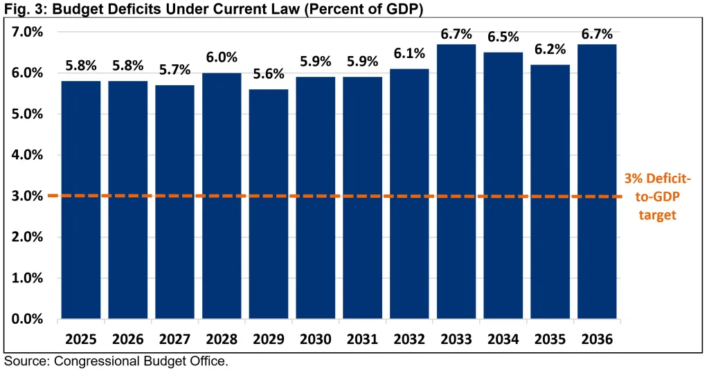 As a share of the economy, CBO projects deficits will average 6.1% of GDP over the next decade – twice the 3% of GDP deficit target needed to put the debt on a sustainable path. Annual deficits will rise from 5.8% of GDP in 2025 to 6.0% in 2028, dip in 2029, then grow to 6.7% of GDP by 2036.