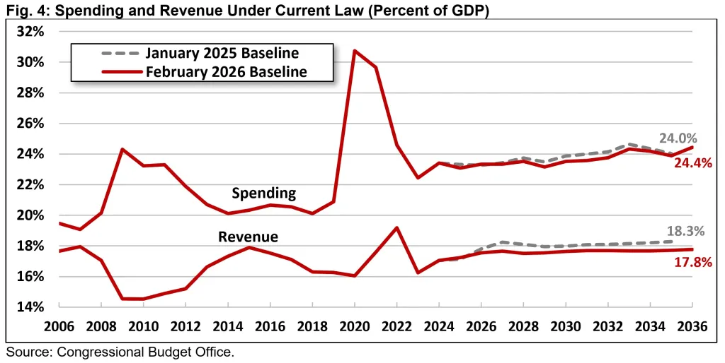 - Spending is larger and growing faster than revenue. Spending will rise from 23.1% of GDP ($7.0 trillion) in 2025 to 24.4% ($11.4 trillion) by 2036. Revenue will rise from 17.2% of GDP ($5.2 trillion) to 17.8% ($8.3 trillion) in 2036.