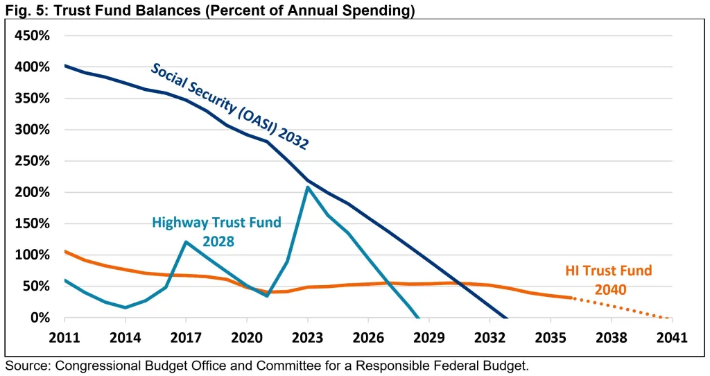 - Major trust funds are approaching insolvency. The Highway Trust Fund will deplete its reserves by 2028, the Social Security retirement trust fund in 2032, and the Medicare Hospital Insurance trust fund around 2040.
