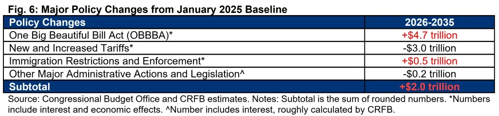 Between FY 2026 and 2035, CBO projects deficits will be $1.4 trillion higher than in its January 2025 baseline, with major policy changes adding about $2 trillion to deficits. CBO estimates OBBBA, alone, will add $4.7 trillion to deficits through 2035 including interest and macrodynamic effects, while changes in immigration policy will add an additional $0.5 trillion. Partially offsetting these costs, new tariffs will reduce deficits by about $3 trillion, and other legislative and administrative actions will on net save roughly $0.2 trillion.