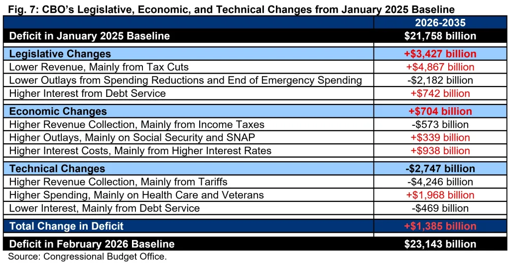 Broken down by the traditional legislative, economic, and technical categories, CBO finds that legislative changes (excluding dynamic effects but including certain baseline quirks) will increase deficits by $3.4 trillion, technical changes (including the direct but not behavioral effects of tariffs) will reduce deficits by $2.7 trillion, and economic changes will increase deficits by $0.7 trillion.