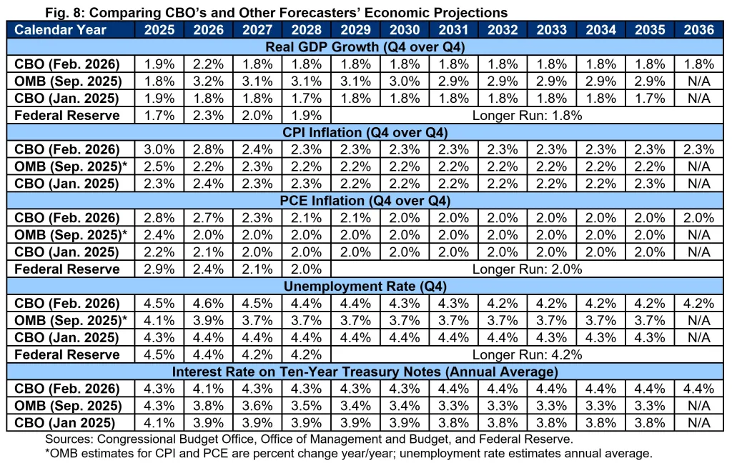 CBO projects strong real GDP growth of 2.2% in 2026, followed by sustained 1.8% growth after the “sugar high” boost from recently enacted policies dissipates.