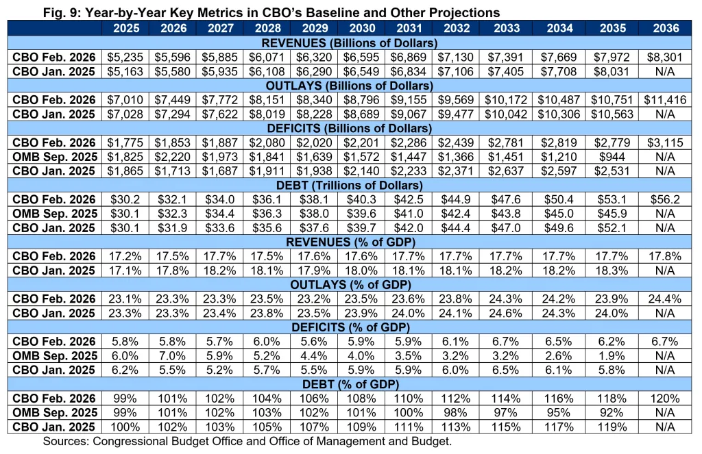 The Congressional Budget Office (CBO) released its February 2026 Budget and Economic Outlook today, updating its January 2025 baseline to account for the One Big Beautiful Bill Act (OBBBA), tariffs, changes in immigration, recent trends in the economy, and other factors. CBO’s latest projections show: