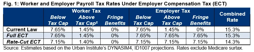 Based on Urban’s modeling, adopting the ECT could also allow a 2-percentage-point rate decrease – to 13.3 percent – on a solvency-neutral basis. Or it could fully restore Social Security and Medicare solvency with roughly a 16.5 percent combined tax rate.