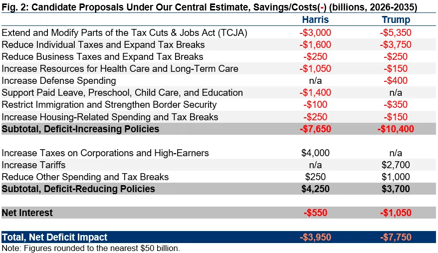 - Vice President Harris would add $3.95 trillion to the projected debt through Fiscal Year (FY) 2035 under our central estimate, as a result of $7.65 trillion of deficit-increasing measures, $4.25 trillion of deficit-reducing measures, and $550 billion of interest costs.