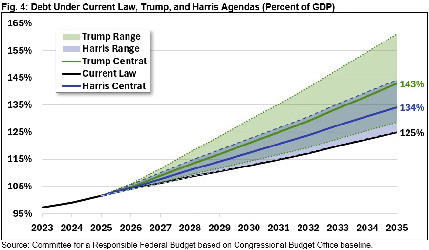 Vice President Kamala Harris has put forward a campaign plan that, if implemented, could add $3.95 trillion to our national debt, sending it to 134 percent of GDP by the end of FY 2035. Meanwhile, former President Donald Trump has put forward a campaign plan that could add $7.75 trillion to the debt, sending it to 143 percent of GDP by the end of 2035.