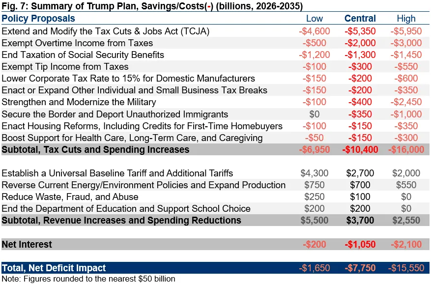 - President Trump would add $7.75 trillion to the projected debt through FY 2035 under our central estimate, as a result of $10.40 trillion of deficit-increasing measures, $3.70 trillion of deficit-reducing measures, and $1.05 trillion of interest costs.