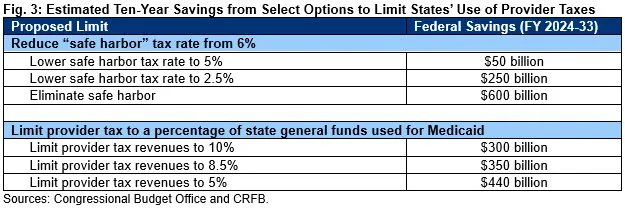 19 The safe harbor has been reduced in the past: from 2008-2011 it went down to 5.5 percent. For other times it was proposed see Committee for a Responsible Federal Budget, “Provider Tax Limits Should Be On the Table for Medicaid Reform,” (March 2016). https://www.crfb.org/blogs/provider-tax-limits-should-be-table-medicaid-reform.