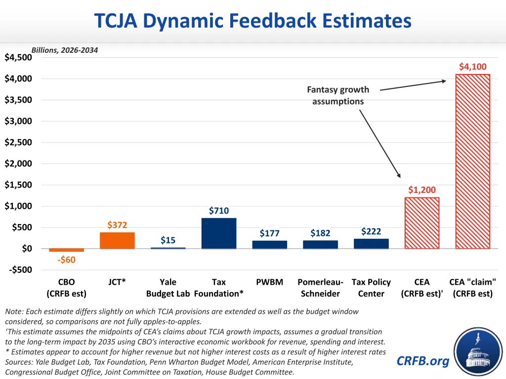 - CEA’s estimates of the effects of TCJA on growth are three times as high as the rosiest independent estimate (Tax Foundation), and eight times the average credible estimate.