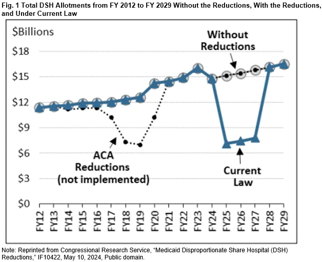 5 Congressional Research Service (CRS), “Medicaid Disproportionate Share Hospital (DSH) Reductions,” IF10422, May 10, 2024, https://crsreports.congress.gov/product/details?prodcode=IF10422.