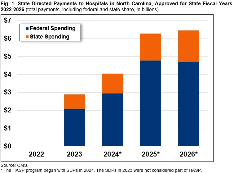Beginning in the state's fiscal year 2024, CMS approved HASP to start paying SDPs that brought total payments to eligible hospitals up to the average commercial rate.16 (Prior to that time, in 2023, the new non-HASP SDPs had totaled $3 billion – 14 percent of North Carolina’s total Medicaid spending in that year.17 ) Since then, SDP totals have more than doubled to more than $6 billion. 18